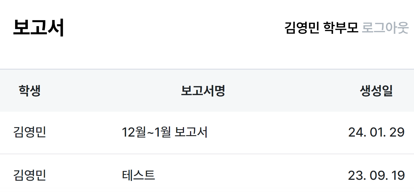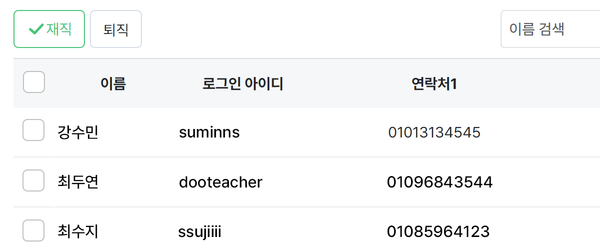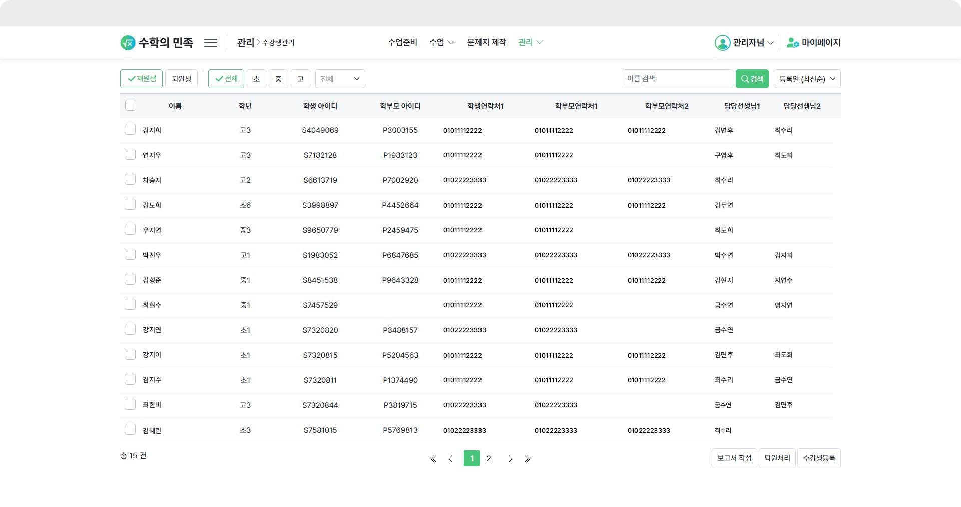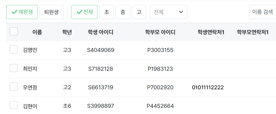 재원생 퇴원생 등 필터를 통해 학생들의 정보를