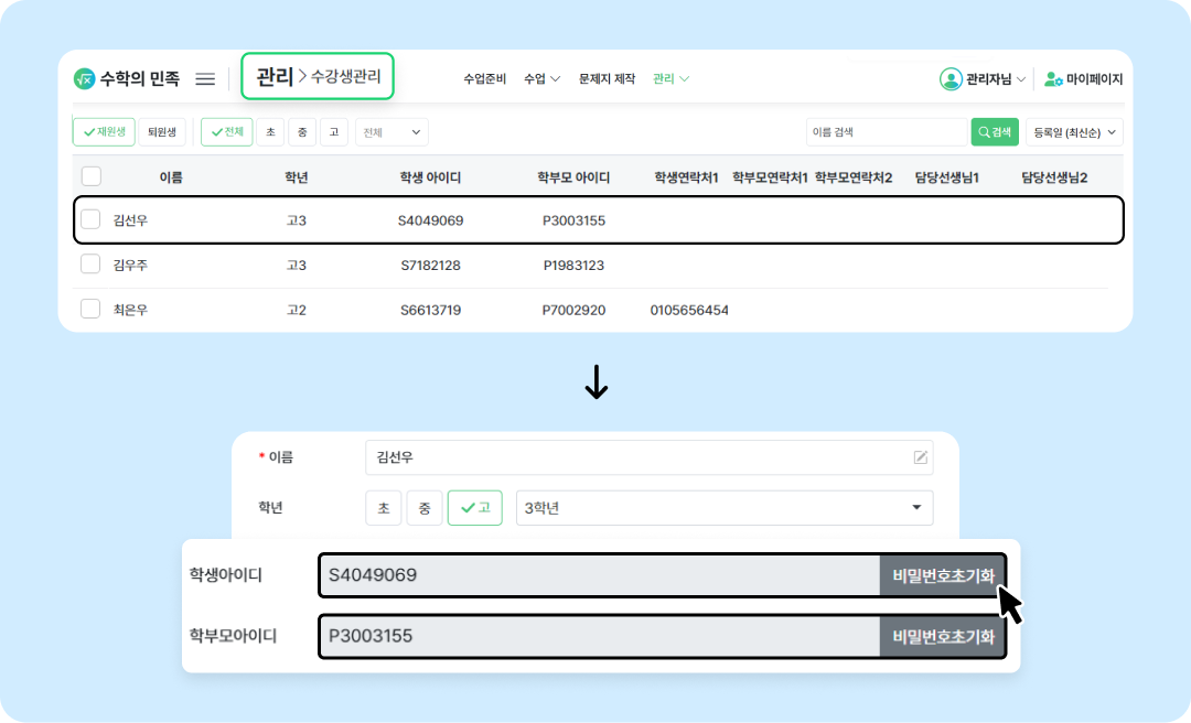 만약, 아이디와 비밀번호가 기억나지 않는다면 담당 선생님께 문의해 주세요.