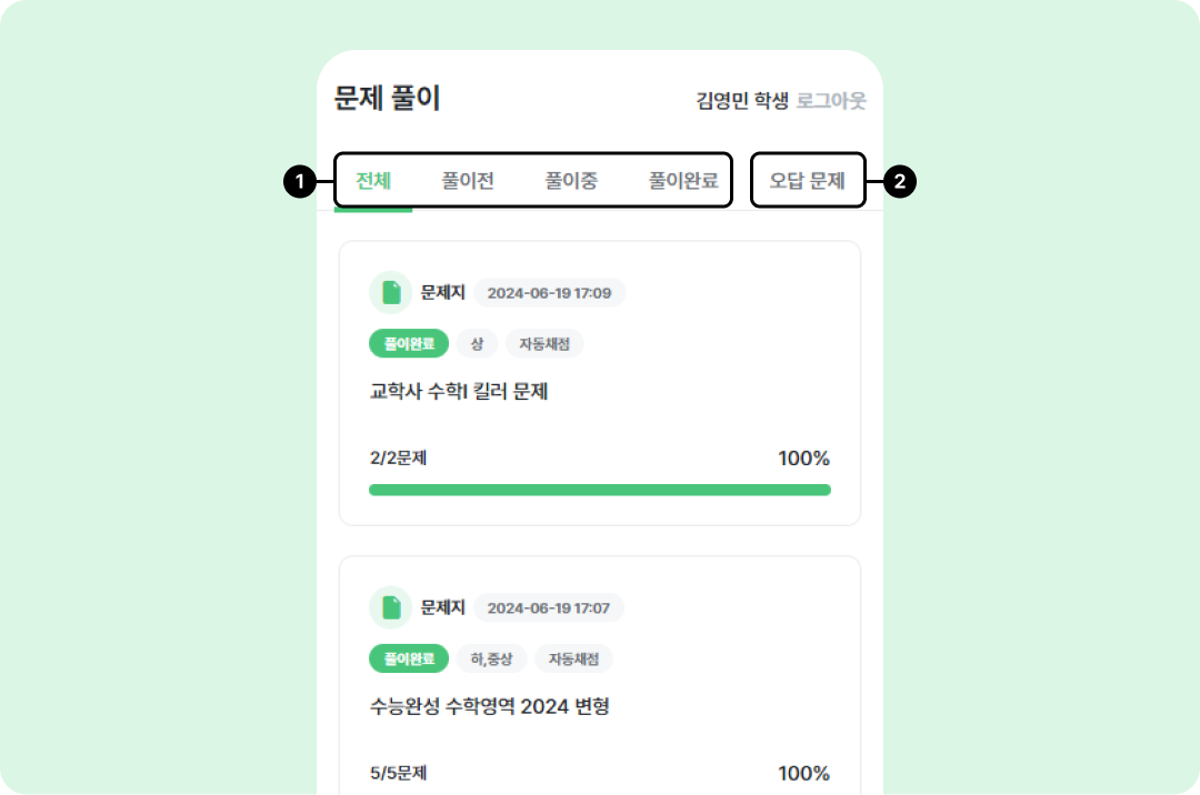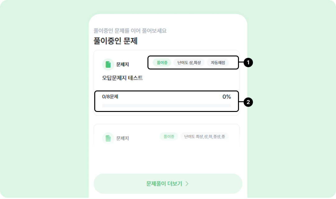 - 그래프를 통해 문제지의 진행상황을 %로 나타내어 한눈에 파악할 수 있어요.
