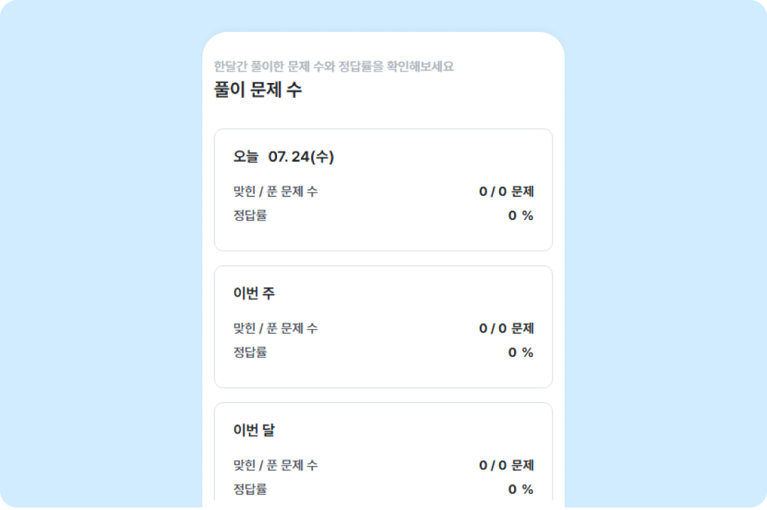 한 달을 기준으로 일/주/월별로 풀이한 문제지의 정답률과 풀이 상황을 확인할 수 있어요.