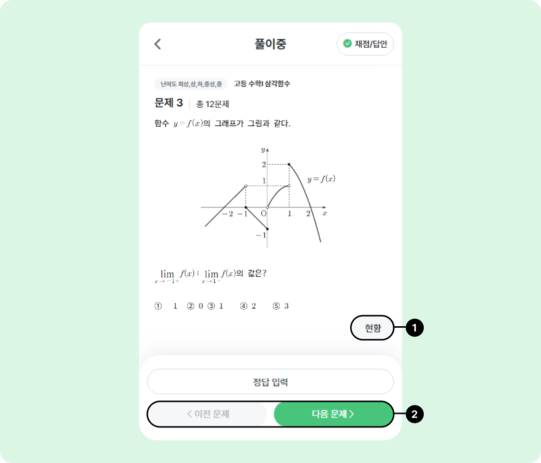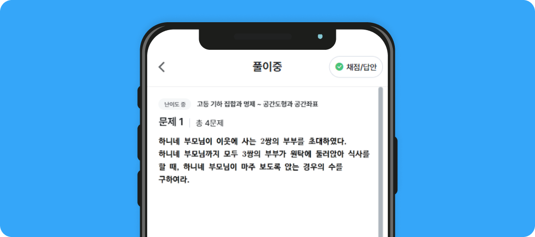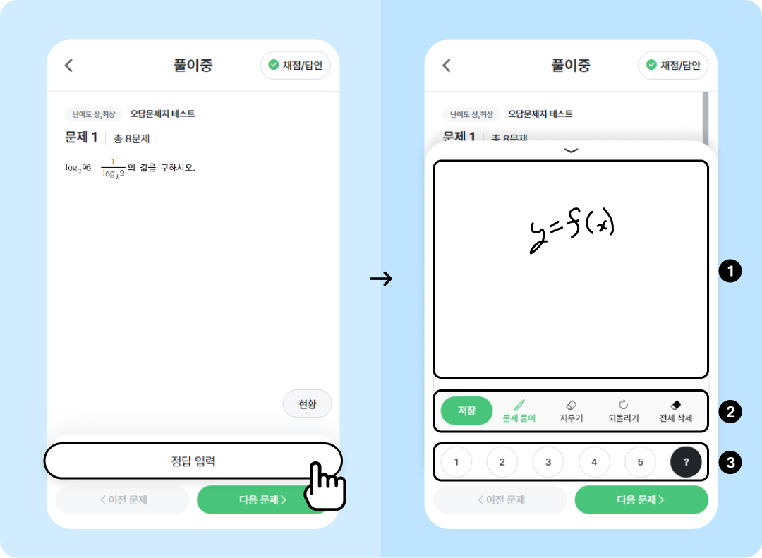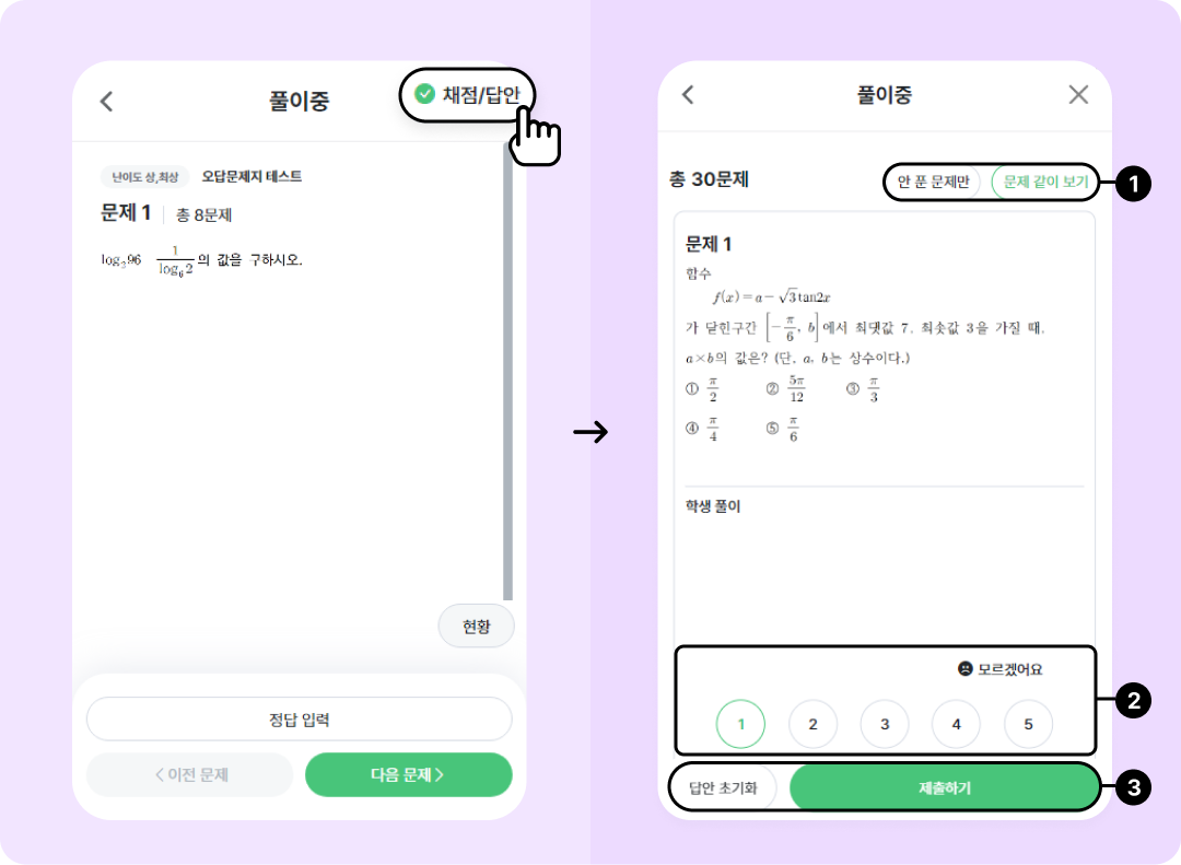 - 이 중인 문제와 풀이 과정을 확인하면서 답안을 바로 선택하거나 기입할 수 있어요.