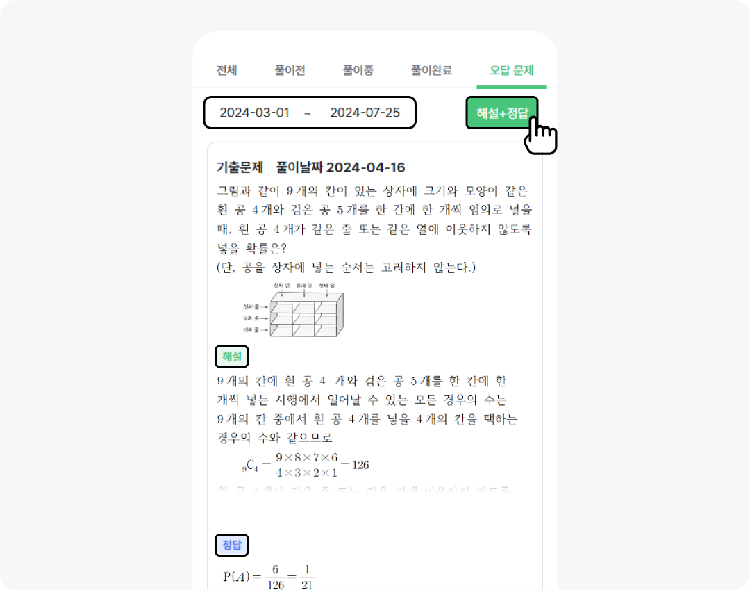- 선택한 기간 동안의 오답문제가 나타나요.
