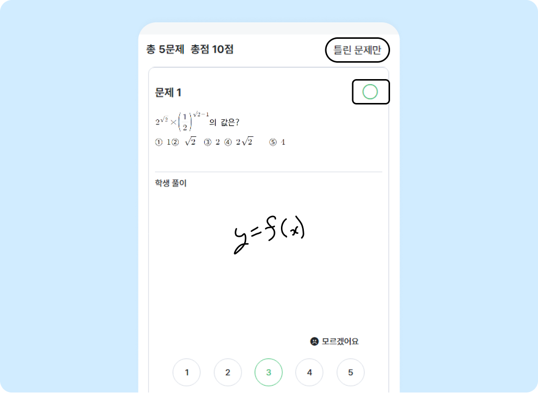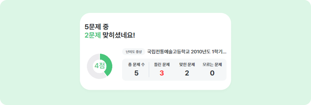 총 문제 수를 기준으로 틀린 문제, 맞힌 문제, 모르는 문제로 세분화하여 문제지의 결과를 명확하게 파악할 수 있어요.