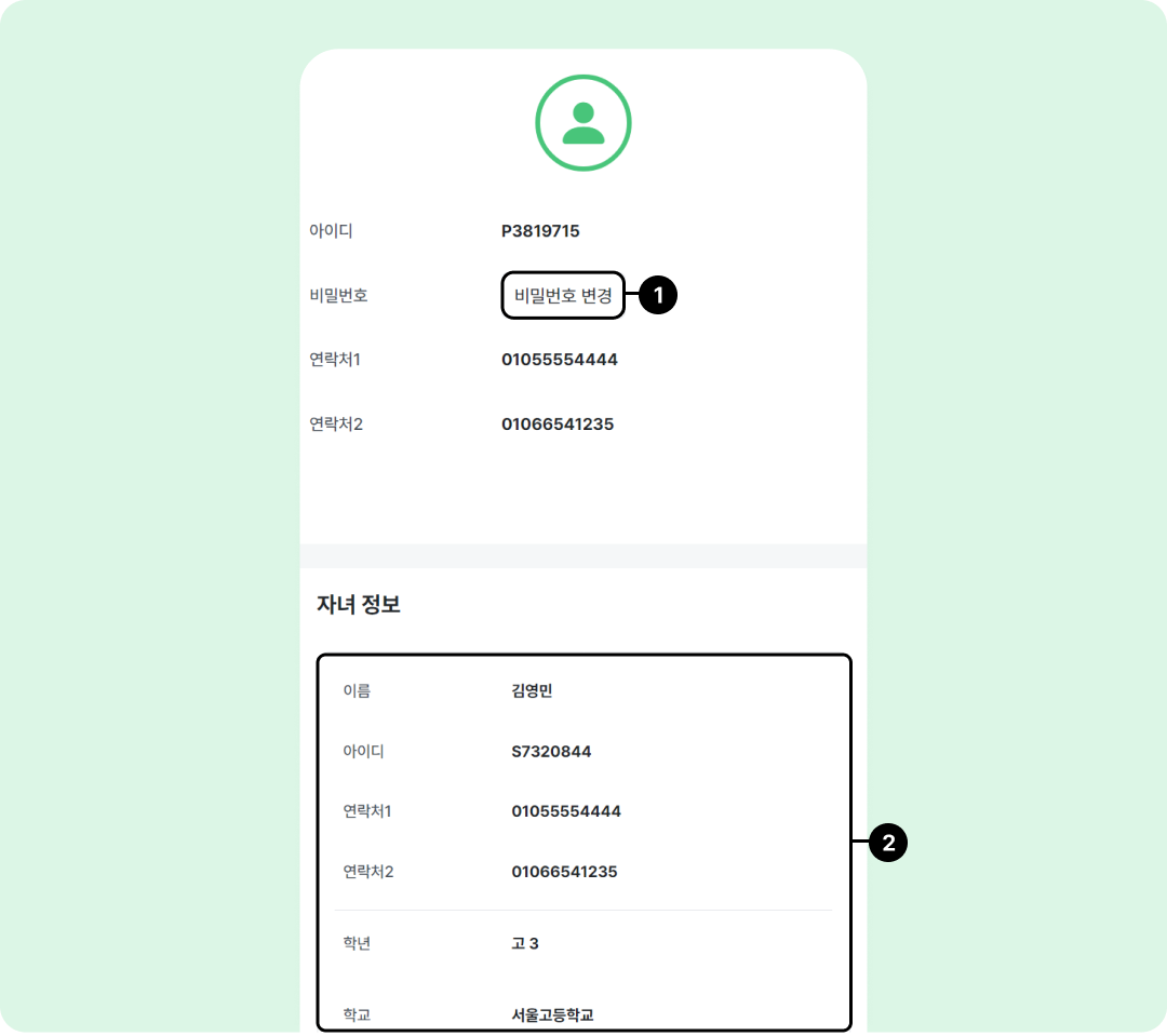 학부모님이 로그인 시 바로 보이는 화면으로, 학생은 해당 페이지가 보이지 않아요.