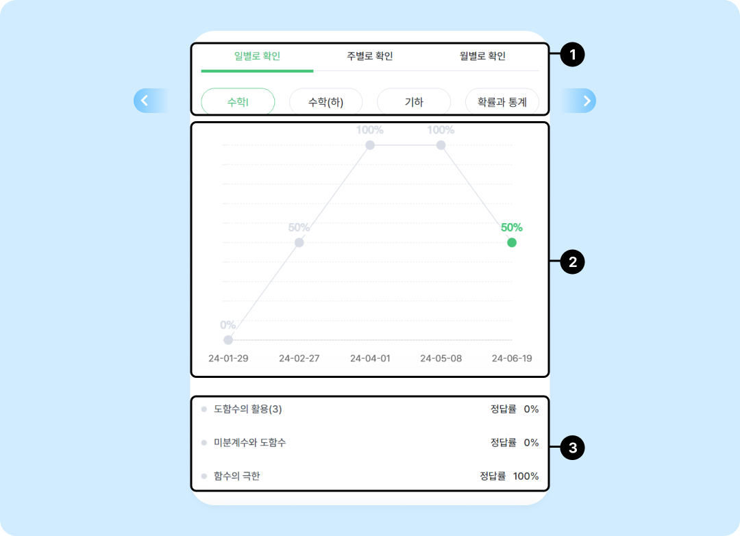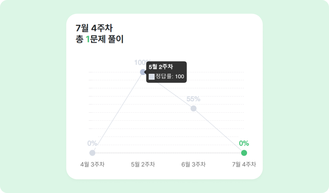 - 선택한 일/주/월 별 기준으로 최대 6개의 데이터를 그래프화하여 날짜별로 정답률을 비교하며 확인할 수 있어요.
